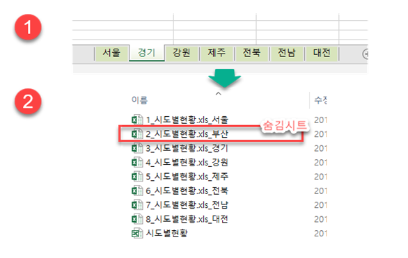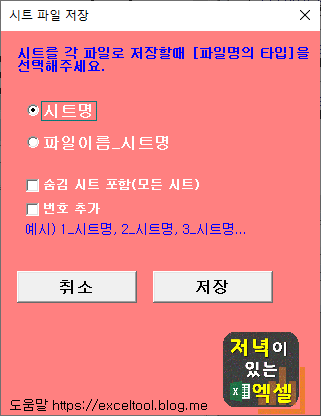 ※ 저장위치는 원본파일과 같은 폴더에 저장되며, [숨김시트 포함]을 체크하면 현재 파일의 숨겨진시트를 포함한 모든 시트가 각각 파일로 저장됩니다.