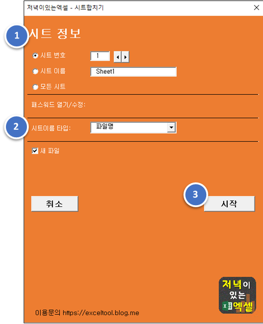 ※ '새 파일'이 체크되면 새 엑셀파일에 시트를 모아줌 (현재 워크시트에 복사를 원하시면 체크를 해제하세요.)