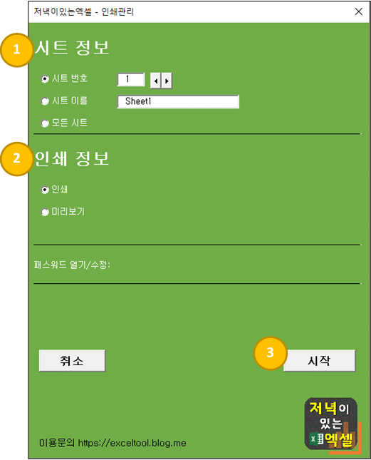 (인쇄로 선택하면 바로 출력이되고, 미리보기로 하면 각 파일의 시트별 인쇄 미리보기가 나타나 검토 후 인쇄 가능)
